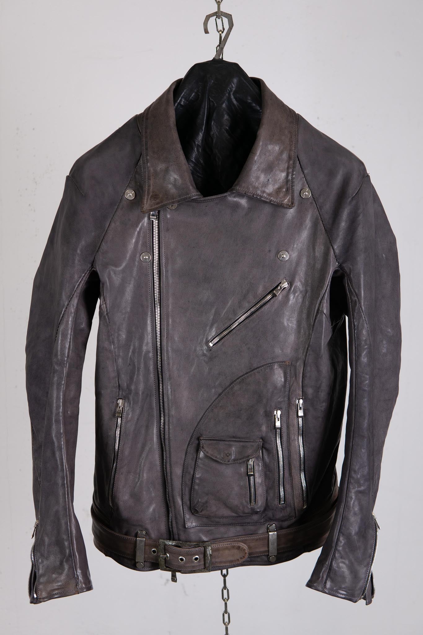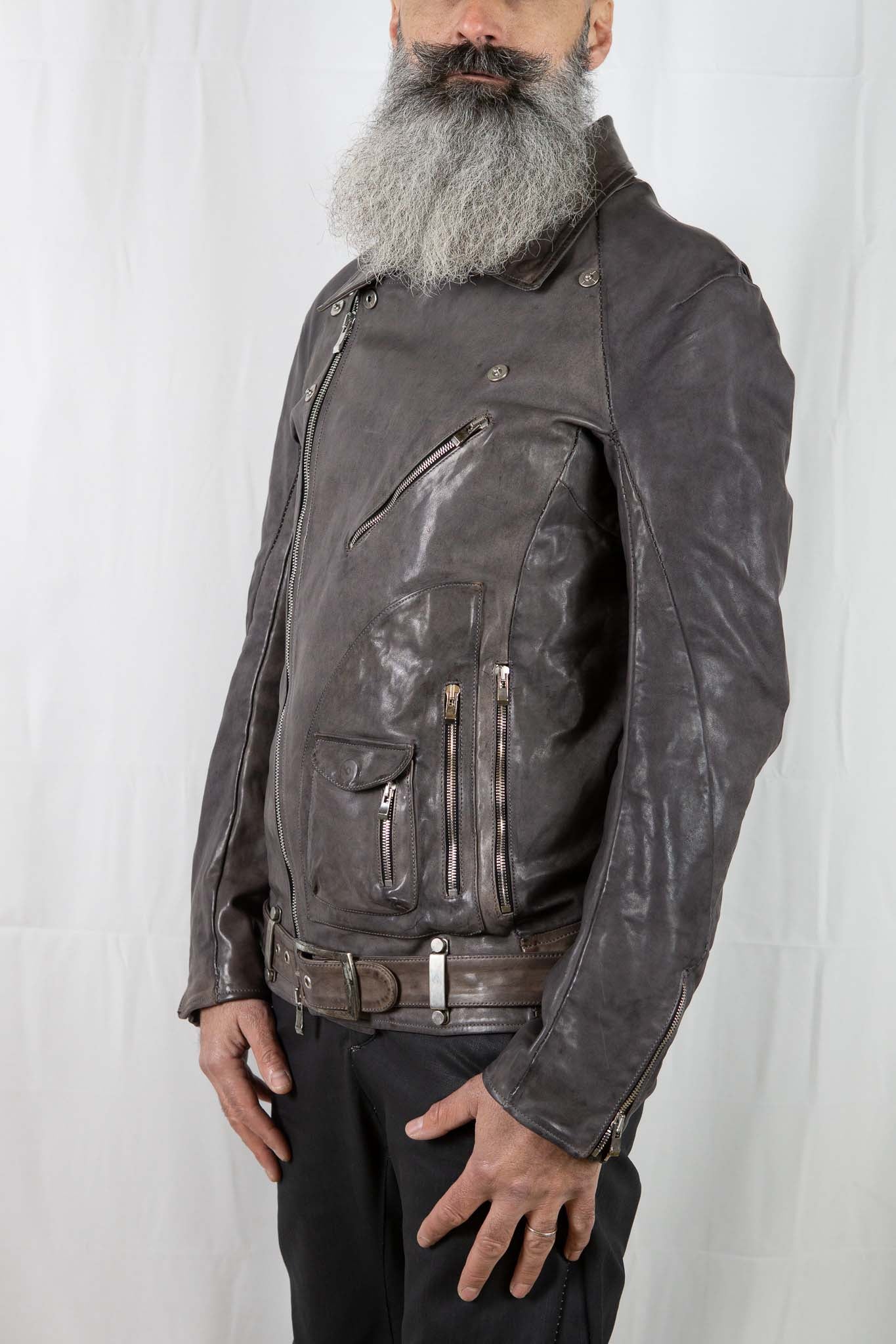 A biker jacket featuring traditional American design elements Features a kidney belt and belt made of thicker leather The shoulders feature stretchable action pleats.
