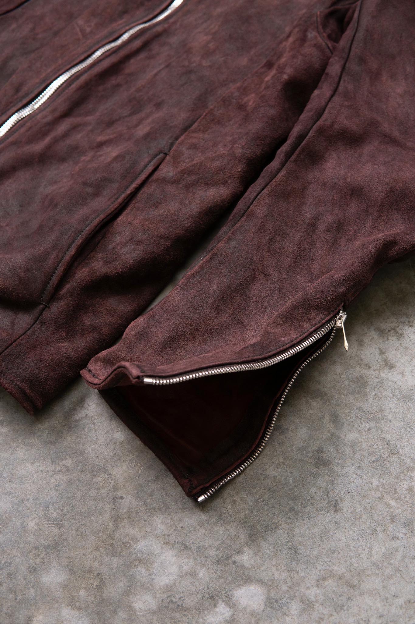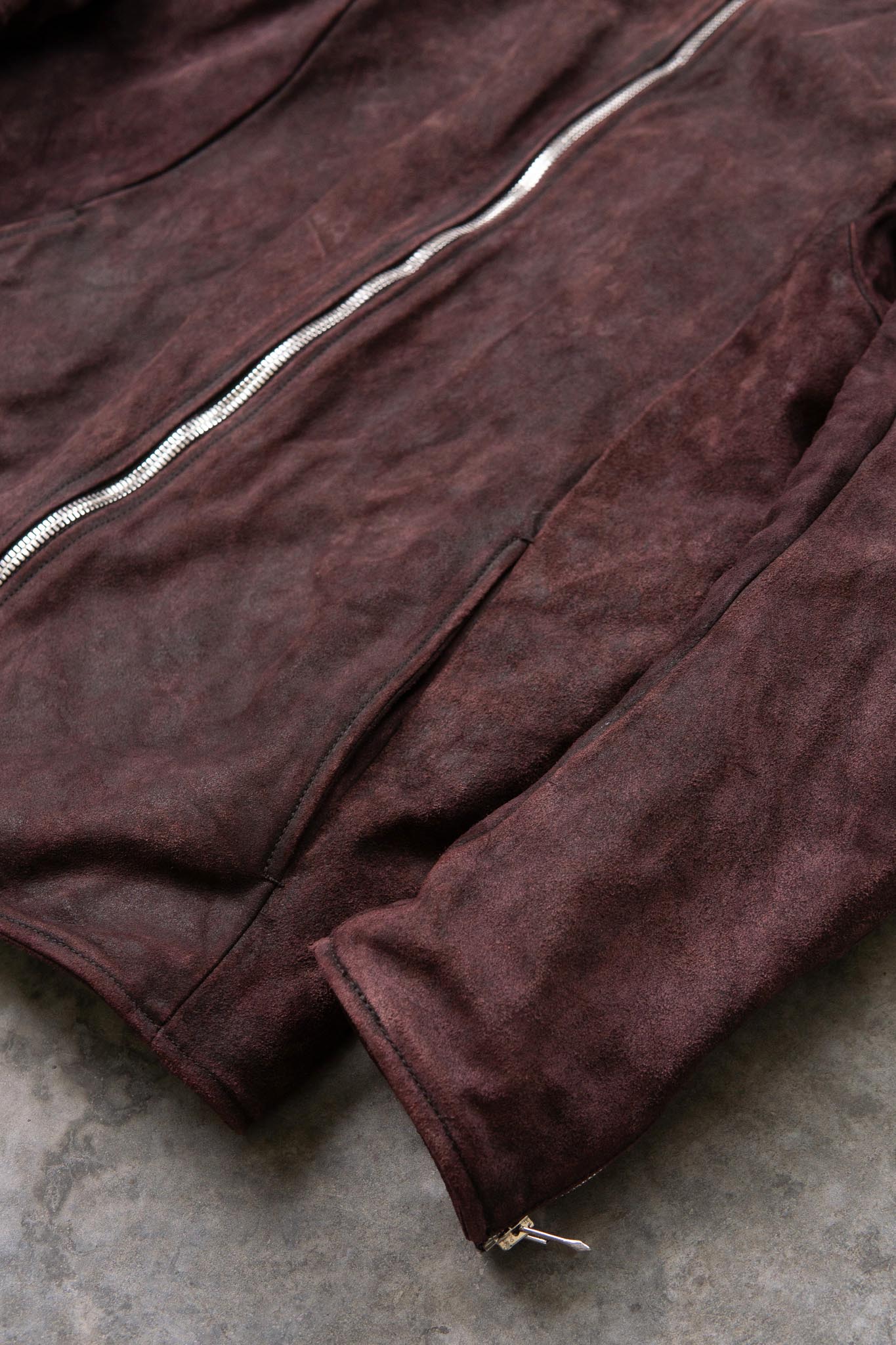 The original Bordeaux suede hairs are raised from under the cracks of the Black resin, creating a contrast of Bordeaux and Black on the surface.