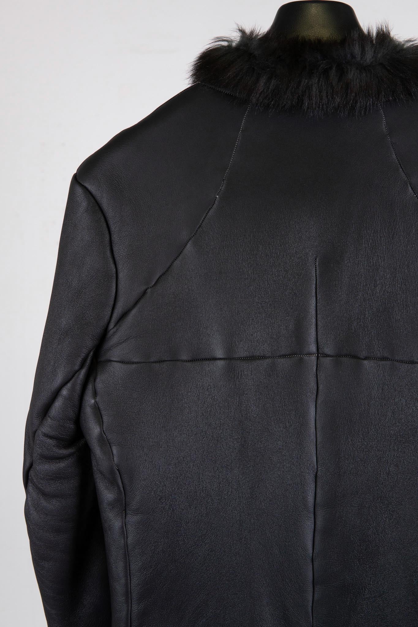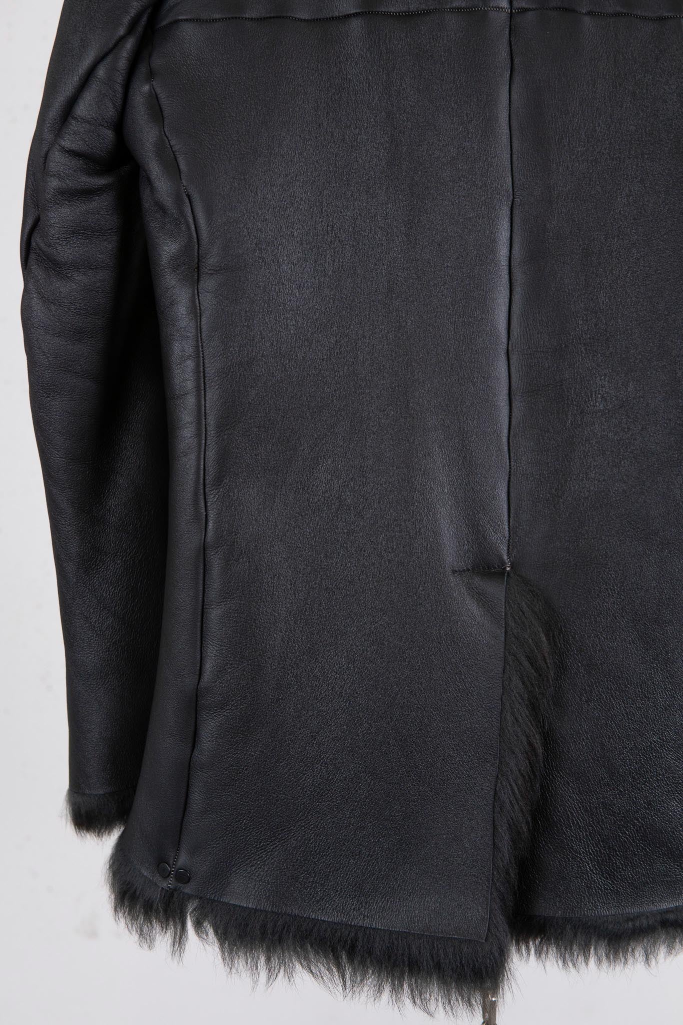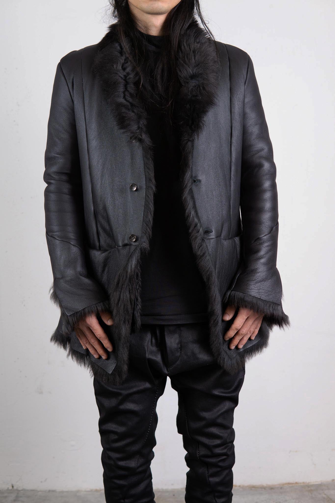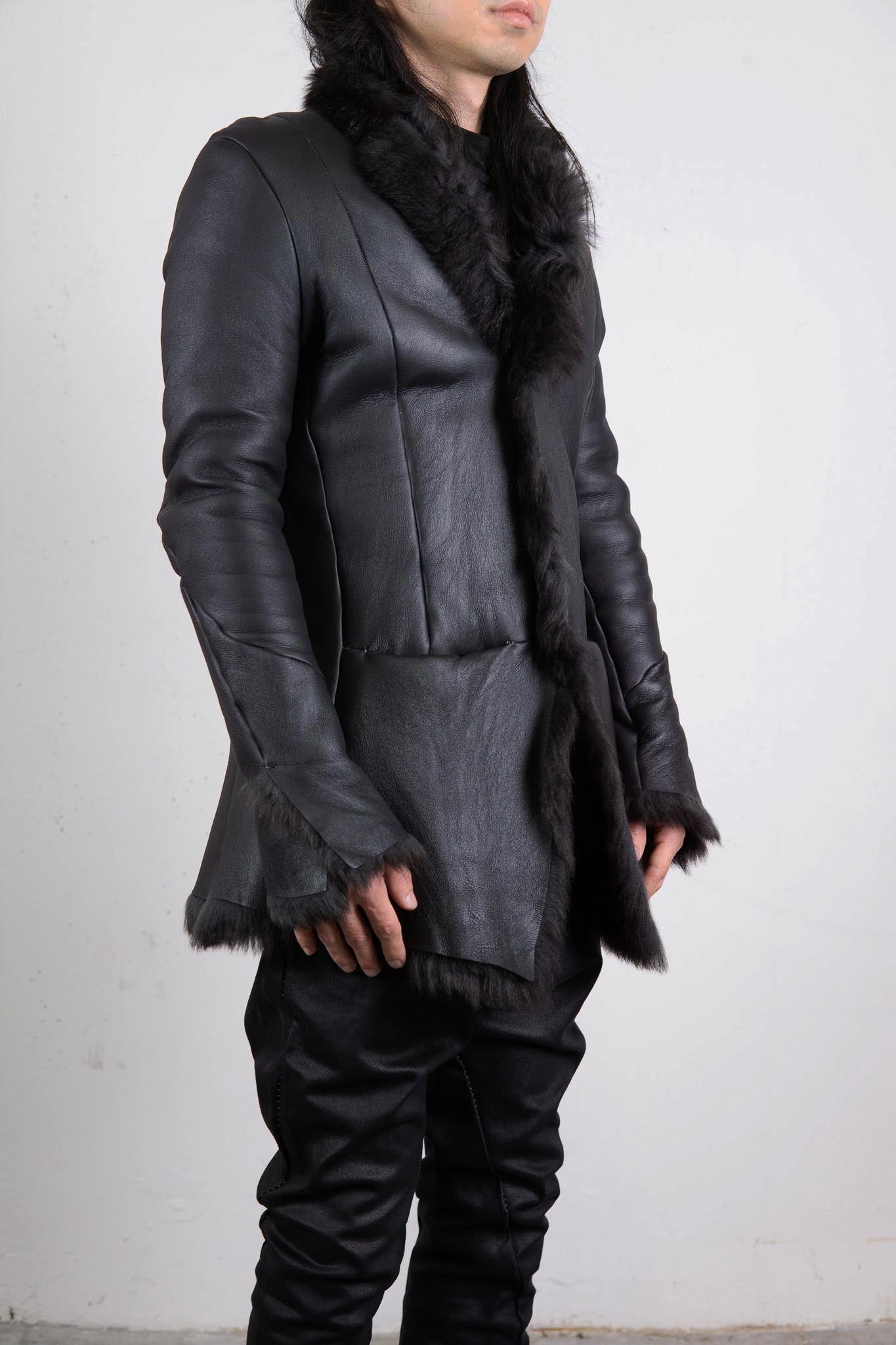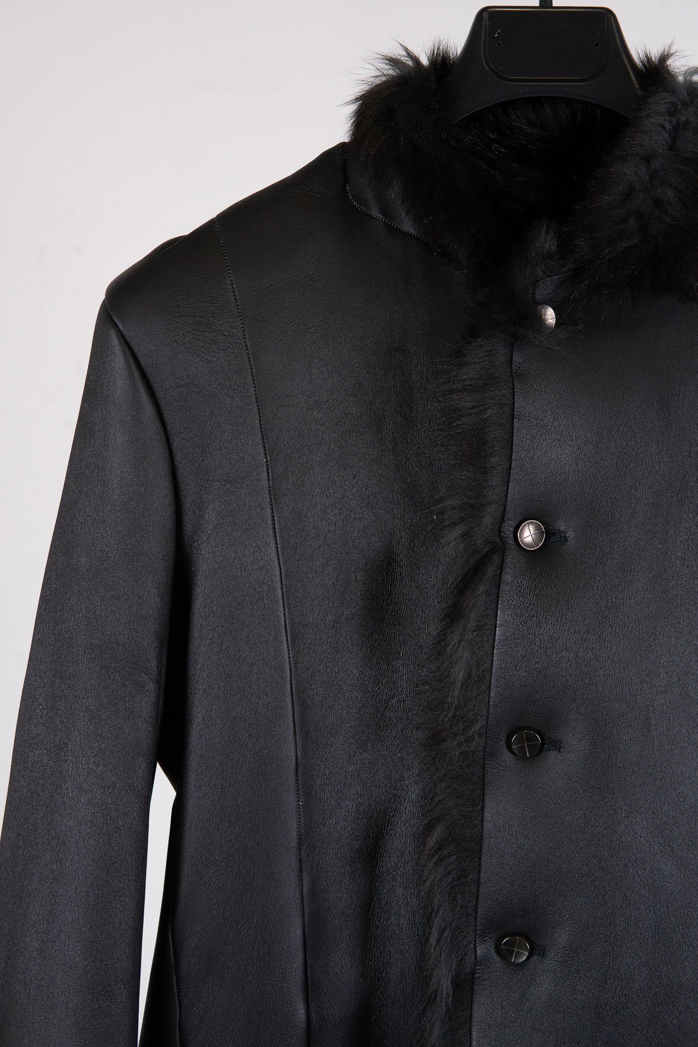 This piece is made using valuable leather stock that incarnation has carefully preserved over time. A seamless rolled-seam construction is employed to reduce the inherent bulk of mouton. The result is a refined silhouette with unnecessary volume eliminated. Uncommon for incarnation, the jacket features a button-front design.